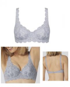 Sutien cu armatura si cupe captusite cu un burete subtire in jumatatea inferioara, buretel acoperit cu dantela si broderie din care pleaca si bretelele, un croi special pentru a asigura o asezare foarte frumoasa pe san si o sustinere buna pana la cupe si circumferinte mari.