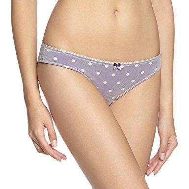Chilot BeeDees by Triumph, avand croiala clasica si putin mai lat pe solduri. Chilotul este din microfibra mov, iar pe deasupra tul transparent cu buline albe.