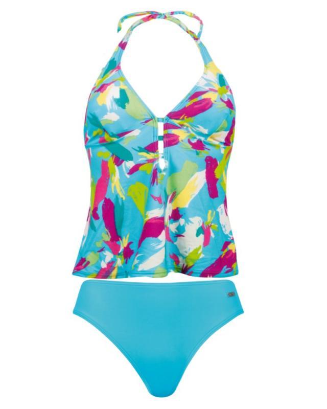 Costum de baie tanchini avand sutienul fara armatura, cupe usor captusite, inchidere dupa gat, decolteul la spate pana la linia sutienului, slipul croiala clasica.