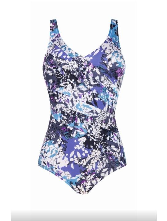 Costum de baie intreg cu proprietati moderate de modelare in zona abdominala. Sutienul are cupele simple, fara burete, cu bretele reglabile, cu armatura pentru a asigura sustinere si confort pana la cupe si circumferinte mari. Materialul are proprietatea de uscare rapida. Decolteul la spate merge putin mai jos de linia sutienului.