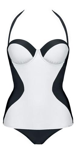 Costum de baie intreg, de la Triumph, cu proprietati usor modelatoare in zona abdominala, avand cupele captusite cu un burete usor si armatura. Bretelele sunt detasabile si se pot pune clasic cu prindere dupa gat sau se pot prinde din mijloc si se inchid tot dupa gat. In partea din spate decolteul este sub linia sutienului cu banda de inchidere in dreptul sutienului pentru a realiza o sustinere cat mai buna.