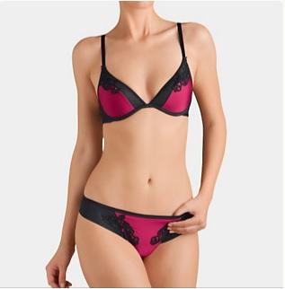 Set din Gama de lux a Triumh (Essence) format din de 2 piese, sutien cu armatura si cupe foarte usor captusite, chilot decoltat la spate (croiala string), broderie aplicata.