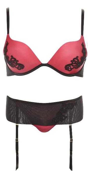 Set de lenjerie intima din gama de luxa Triumph (Essence by Triumph), elegant si foarte feminine format din sutien cu armatura si push-up, chilot hipster cu prelungire pt portjartier. Prelungirile sunt detasabile.